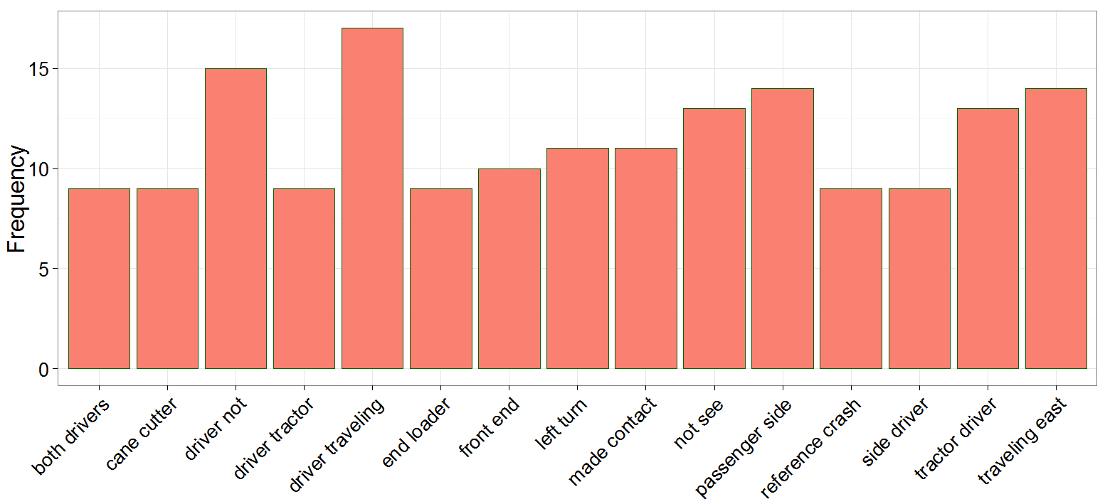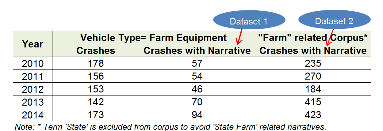 - Primary emphasis is on 'Farm Equipment' related crash narratives.